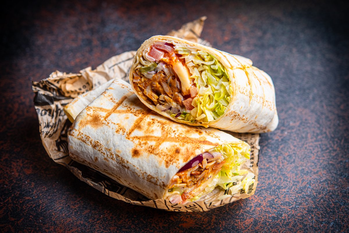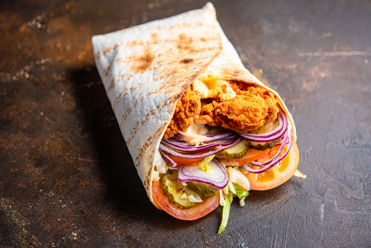 Nisu tortilla,jääsalat,tomat,marineeritud kurk,punane sibul,krõbekana,chillimajoneesikaste