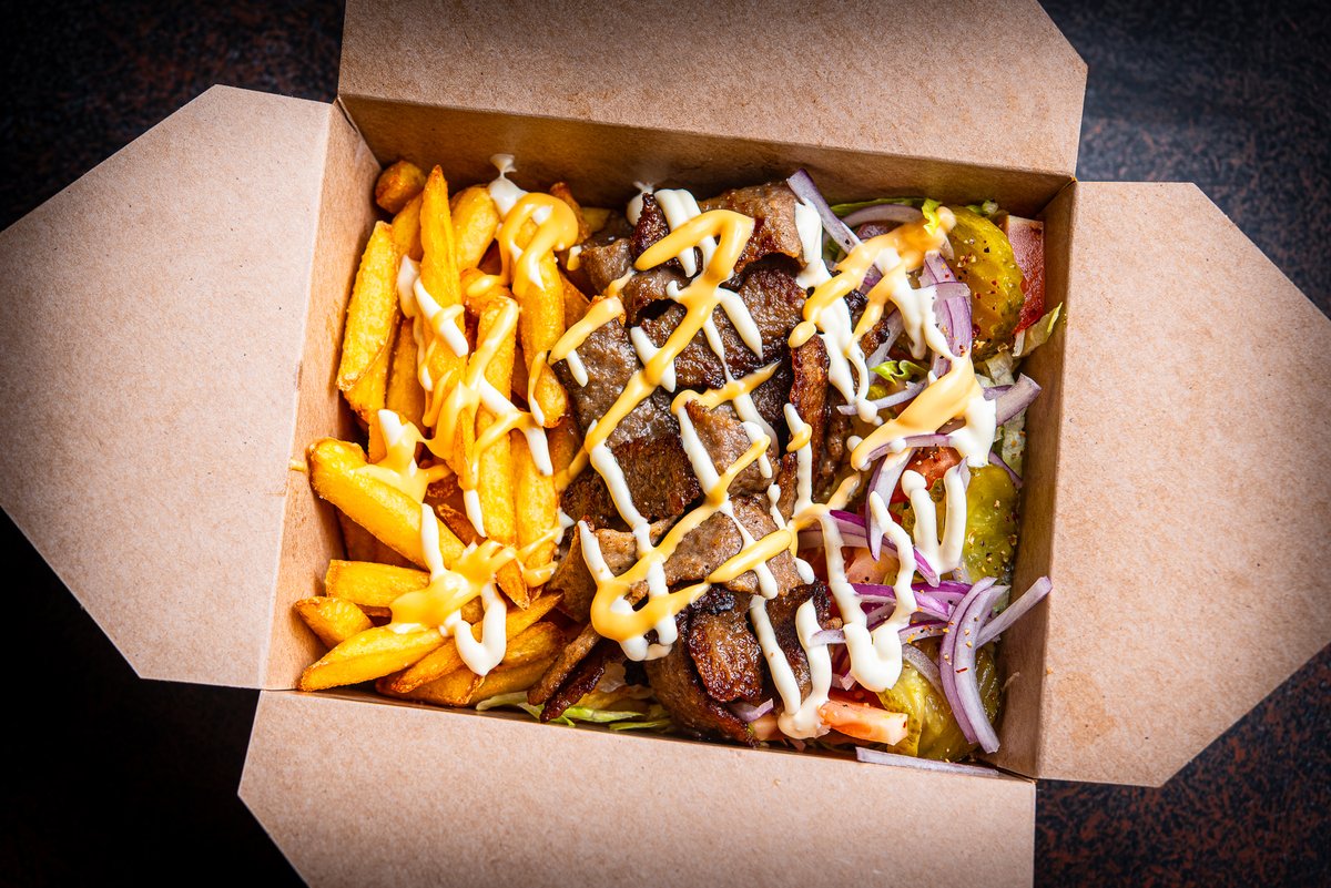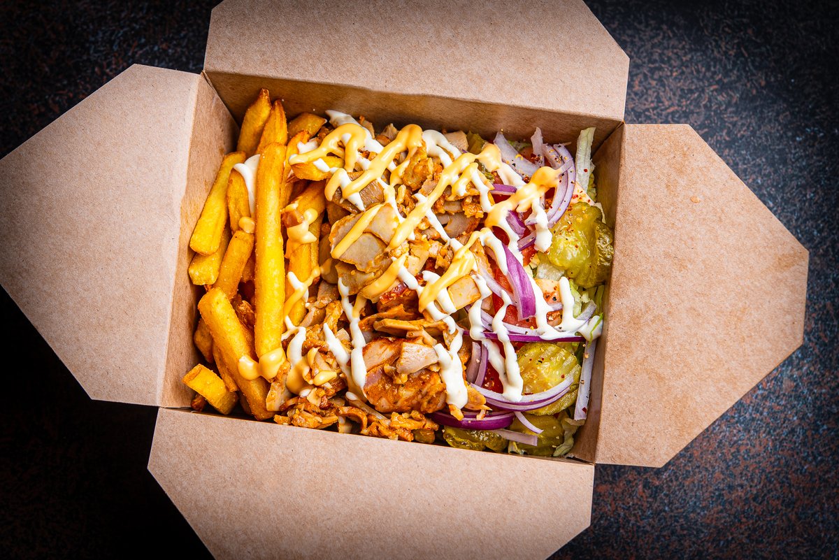 Friikartul, jääsalat, tomat, marineeritud kurk, punane sibul, kana kebab, küüslaugumajoneesikaste, cheddarjuustu kaste