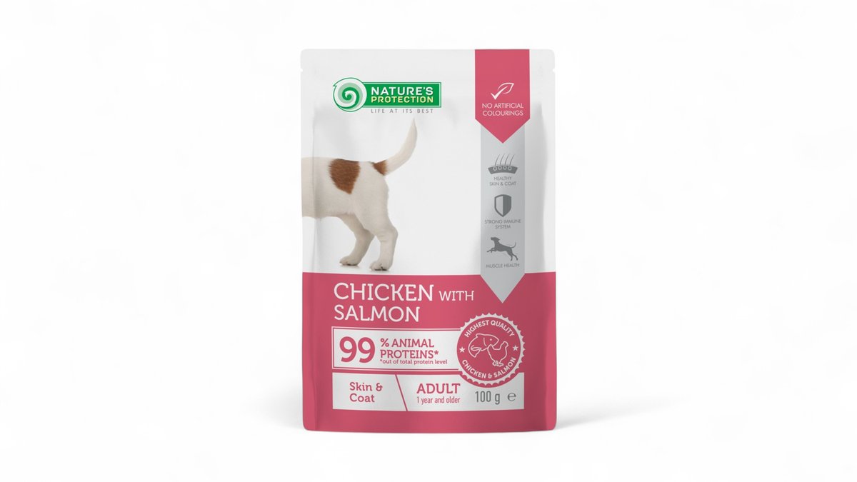 NATURE’S PROTECTION Skin and Coat Dog Adult with Chicken and Salmon, konservsööt kana ja lõhega täiskasvanud koertele, terve naha ja karvkatte heaks, 100 g, pakis