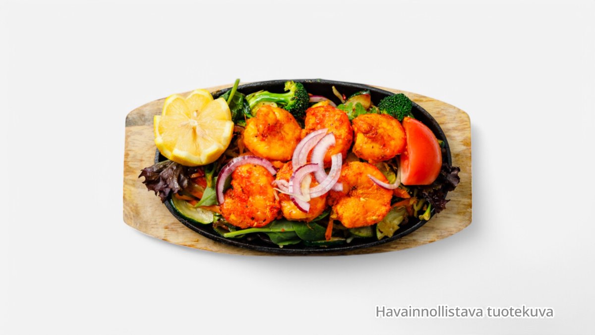 Linssijauholla kuorrutettuja ja friteerattuja jättikatkarapuja chili-, valkosipuli-, sipuli- ja tomaattikastikkeessa (G)
