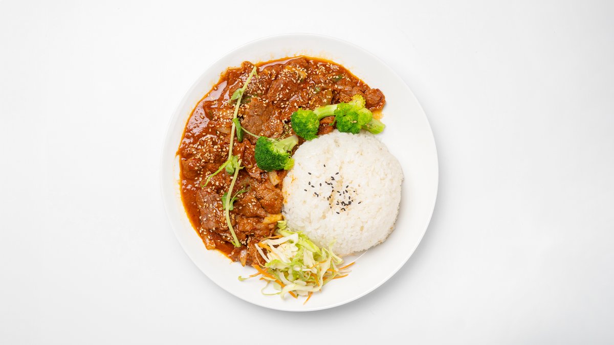 Sisältää:Riisi,Teriyaki naudanliha(suomalainen), siitakesieniä, porkkanoita, maissia, kesäkurpitsaa, lehtikaalia ja kanamunalla. Tarjoillaan talon korealaisella kastikkeella.