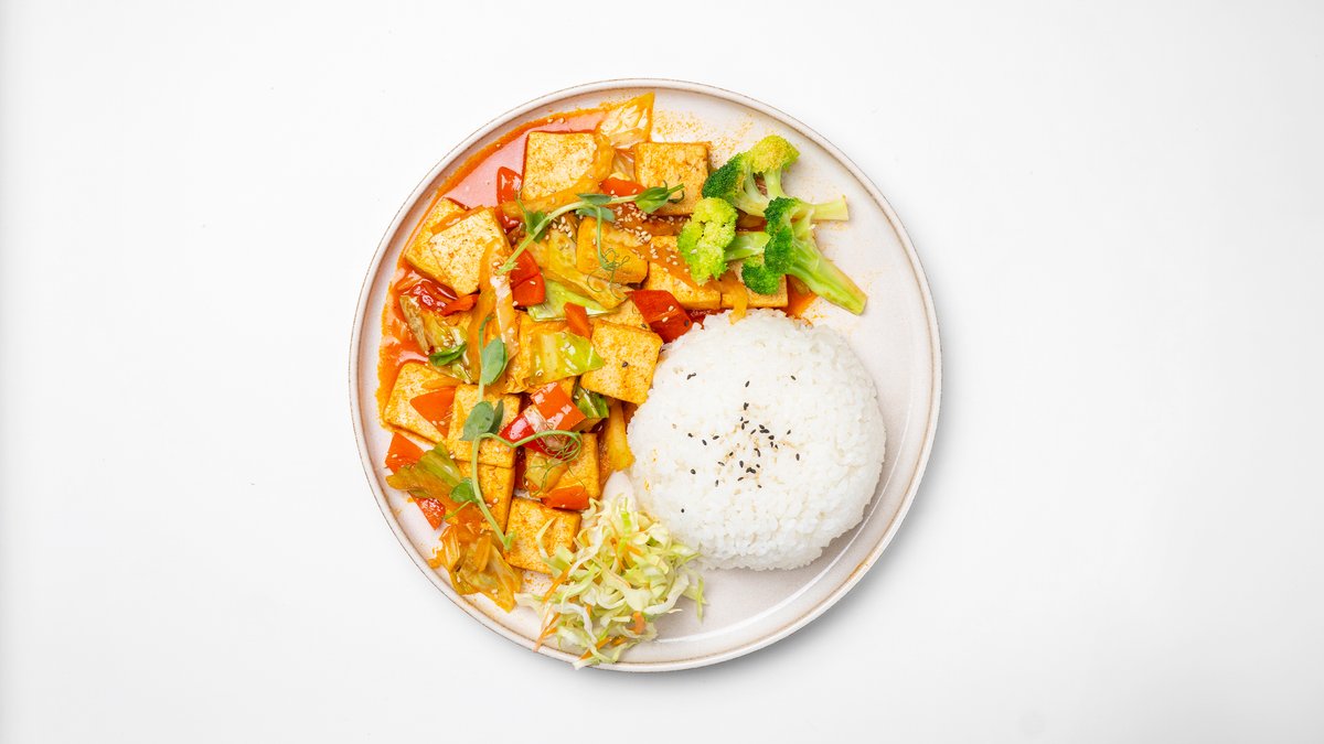 Paistettu tofu ja kasvikset chilikastikkeella, tarjoillaan riisin kera.