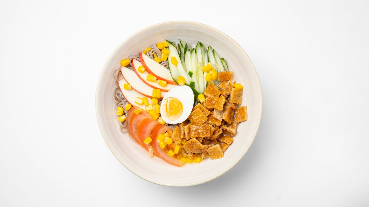 Korealaista kylmää nuudelia tofulla. Sisältää: maissia, omenoita, kurkkuja, tomaatteja ja munia