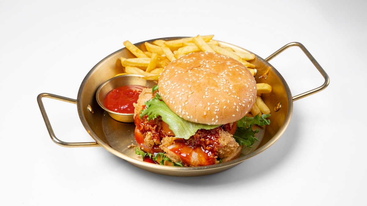 Hampurilainen korealaisen friteeratun kanan kanssa, talon kastikkeella ja ranskalaisilla.