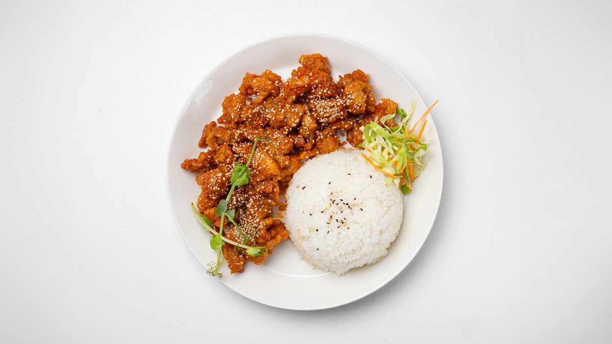 Herkullinen friteerattu kana kääritty meidän speciaalisessa hapanimeläkastikkeessa, tarjoillaan riisillä.