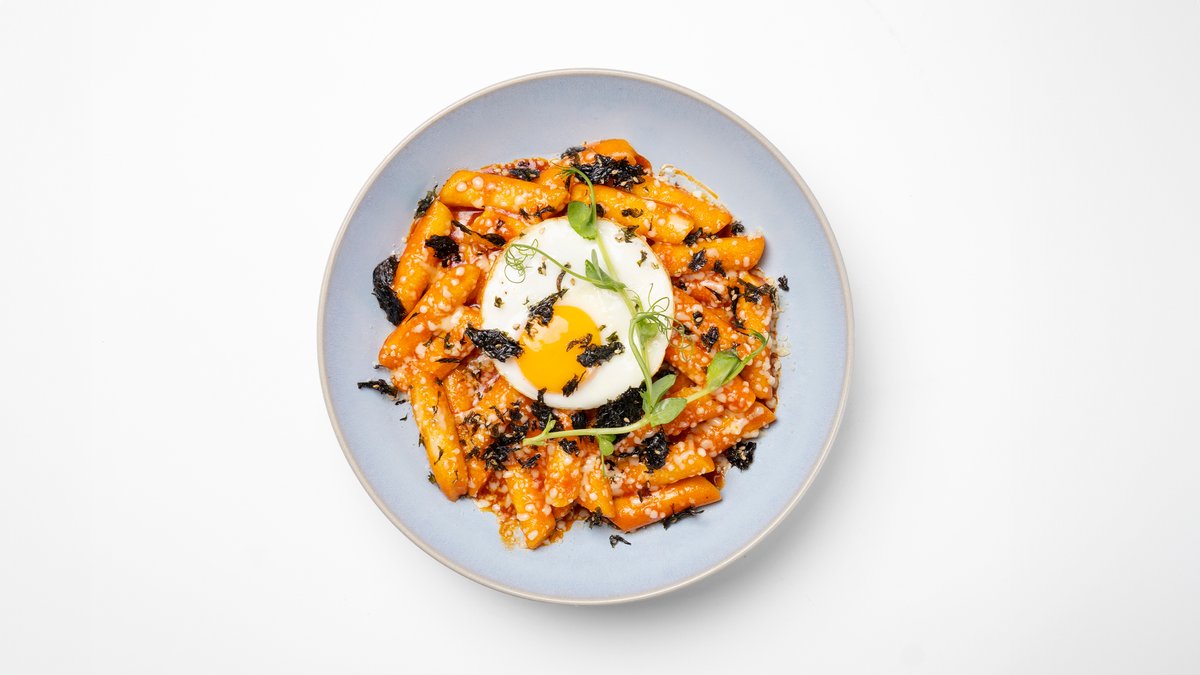 Paistettu tulinen riisikakku korealaisen kastikkeen kanssa ja kananmunalla, ripoteltu suikaloitua merilevää.