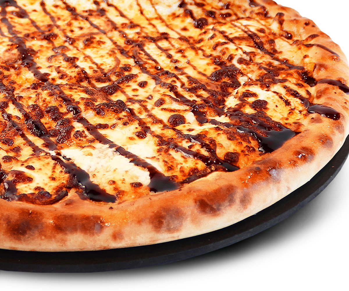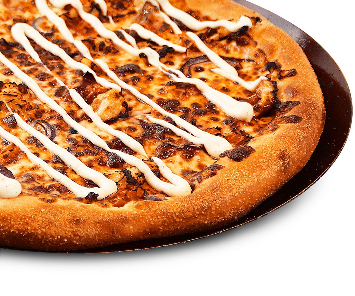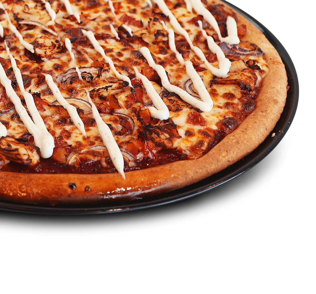 Favorites pizza - Kanaa, tomaattia, punasipulia, tomaattikastiketta, mozzarellajuustoa, pizzan päällä valkosipulikastiketta