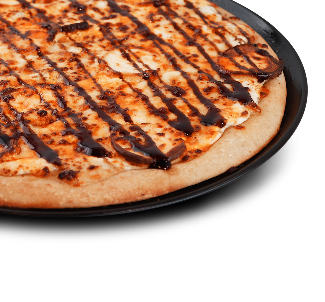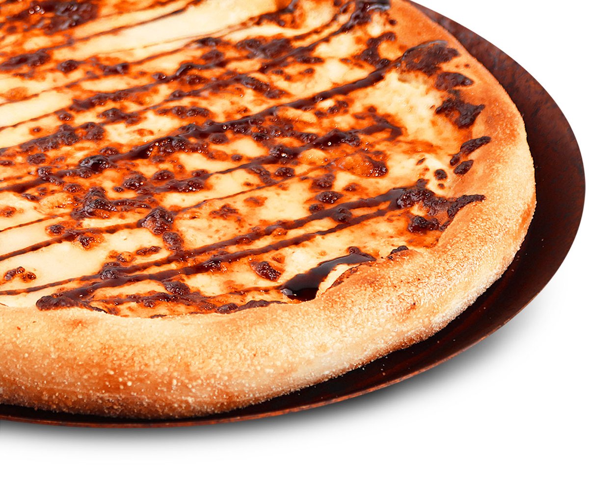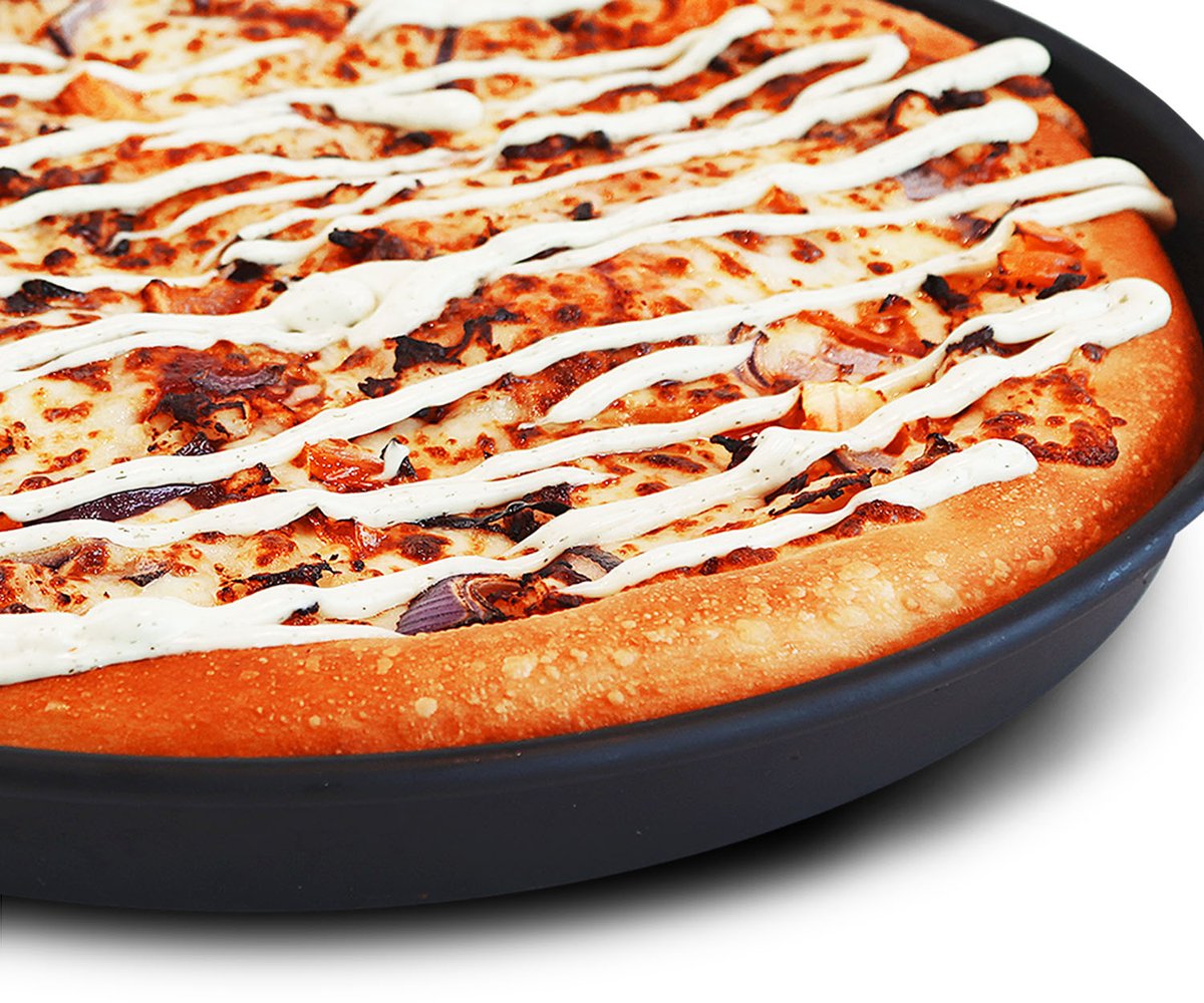 Favorites pizza - Kanaa, tomaattia, punasipulia, tomaattikastiketta, mozzarellajuustoa, pizzan päällä valkosipulikastiketta
