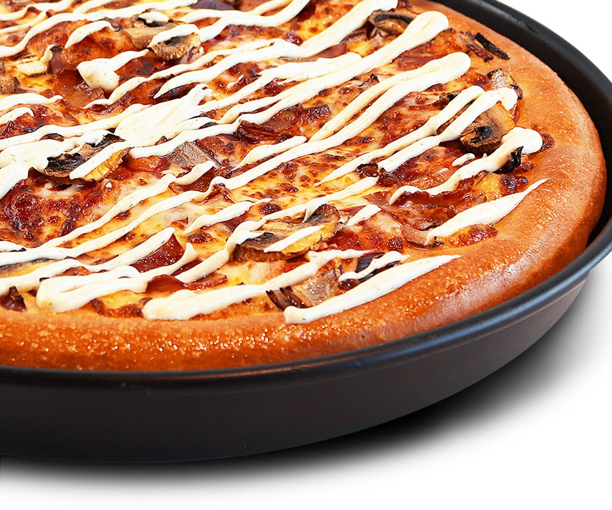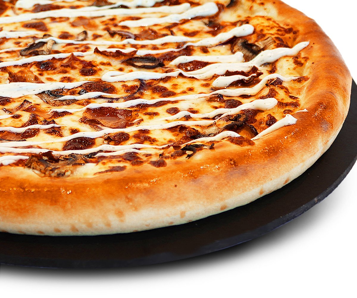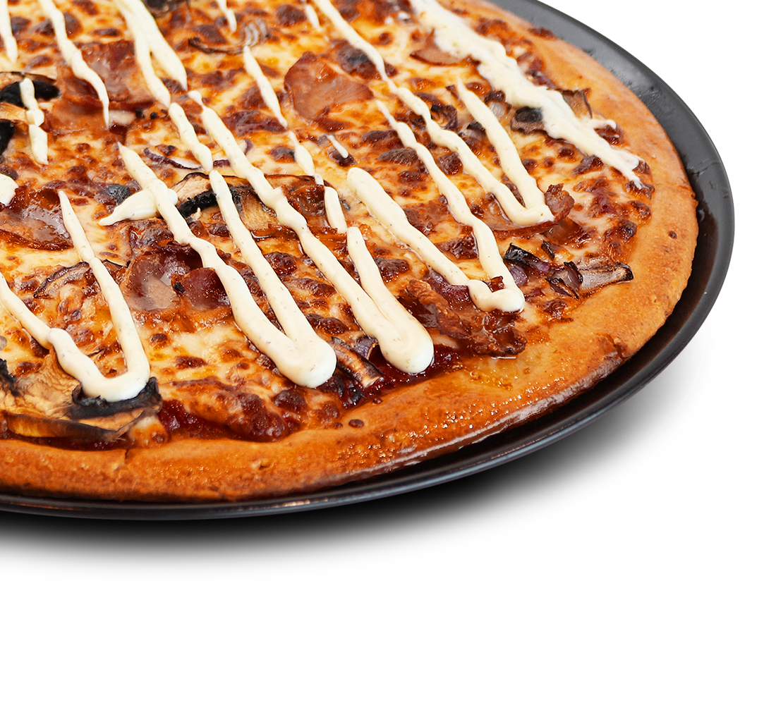 Favorites pizza - Pekonia, herkkusieniä, punasipulia, tomaattikastiketta, mozzarellajuustoa, pizzan päällä valkosipulikastiketta