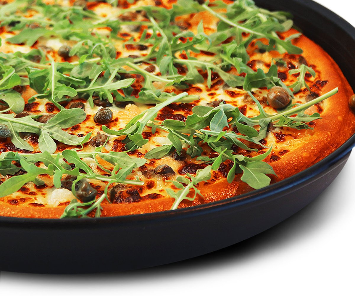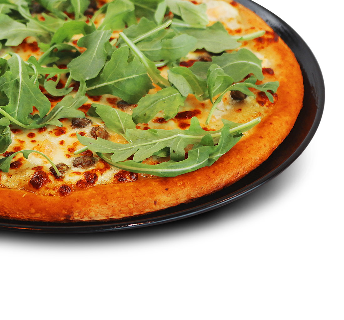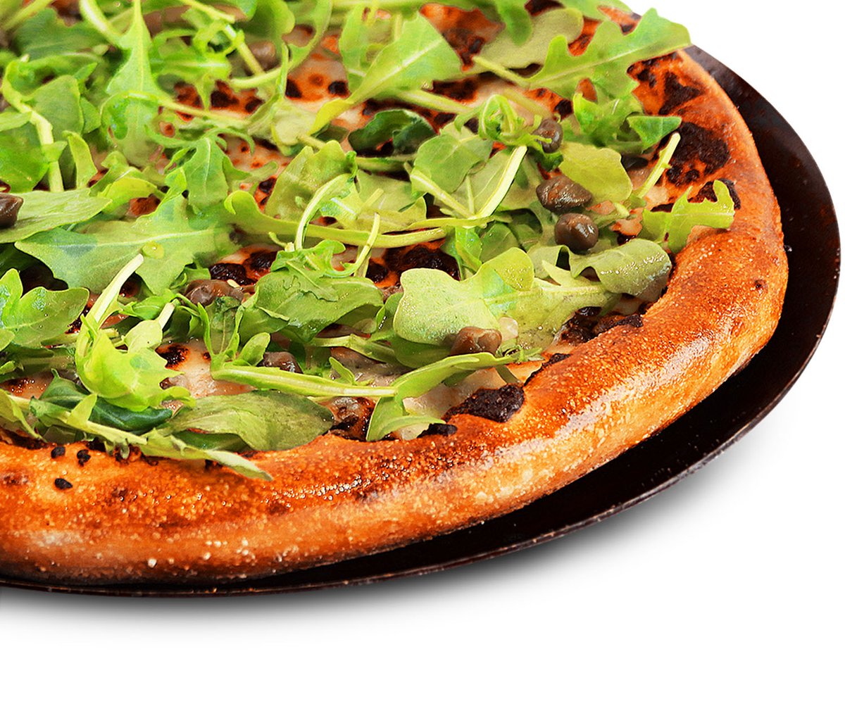 Favorites pizza - Katkarapuja, kaprista, valkosipulia, crème fraîchea ja mozzarellajuustoa, pizzan päällä rucolaa