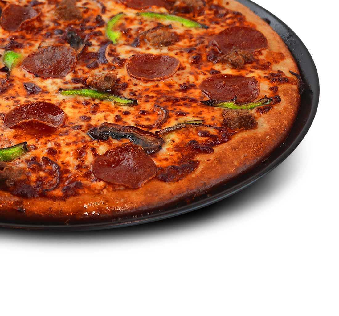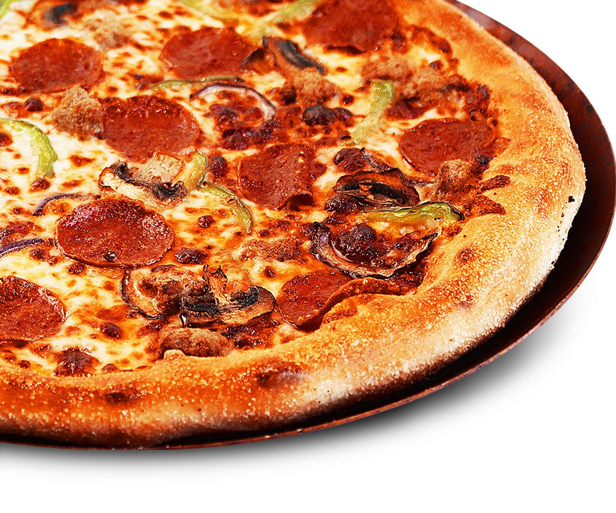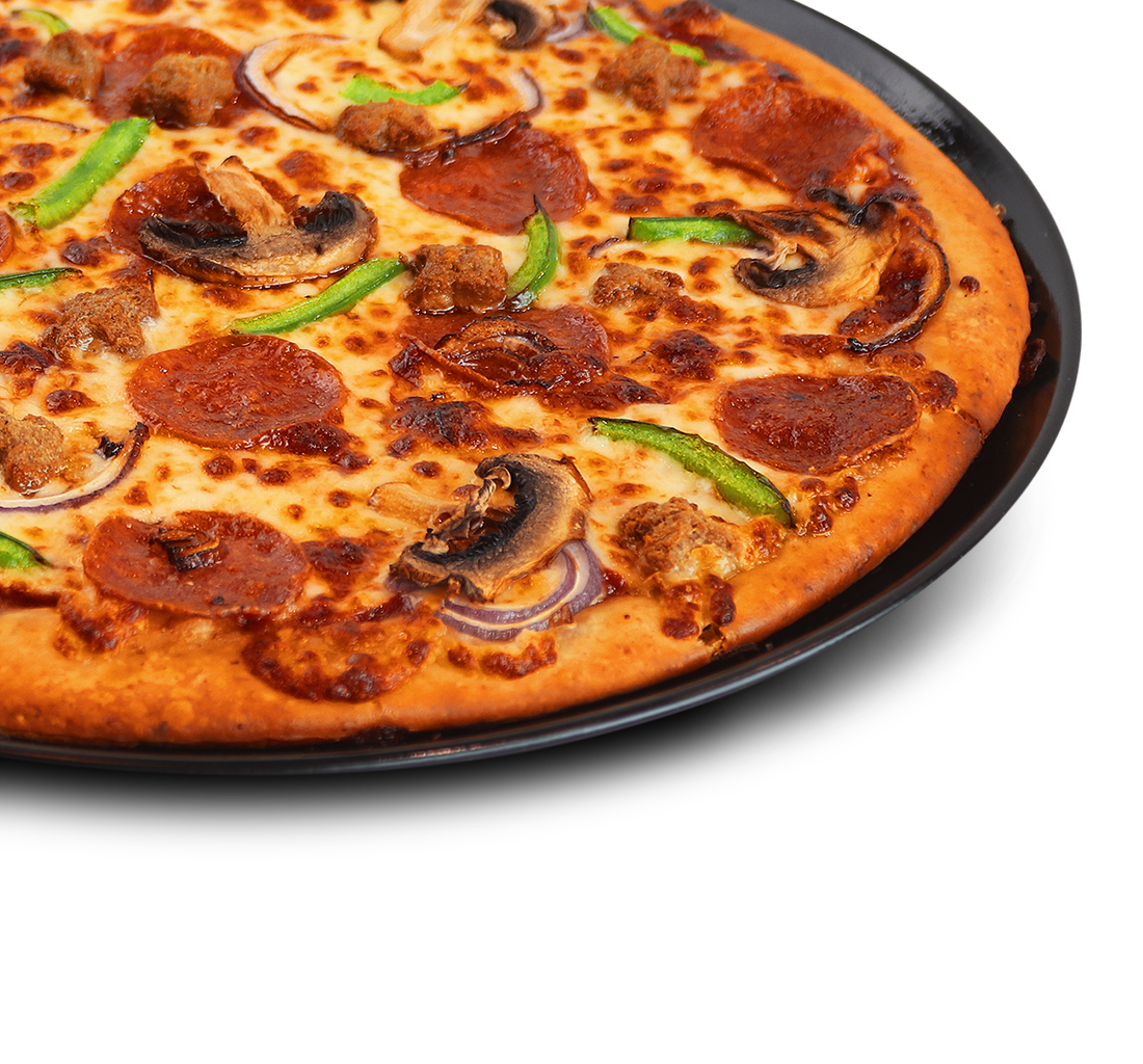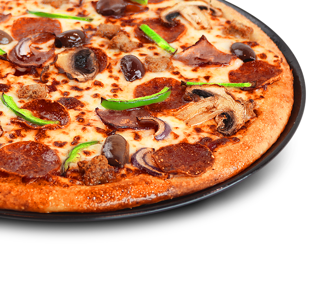 Premium pizza - Naudanlihaa, pepperonia, kinkkua, herkkusieniä, paprikaa, sipulia, oliiveja, tomaattikastiketta ja mozzarellajuustoa