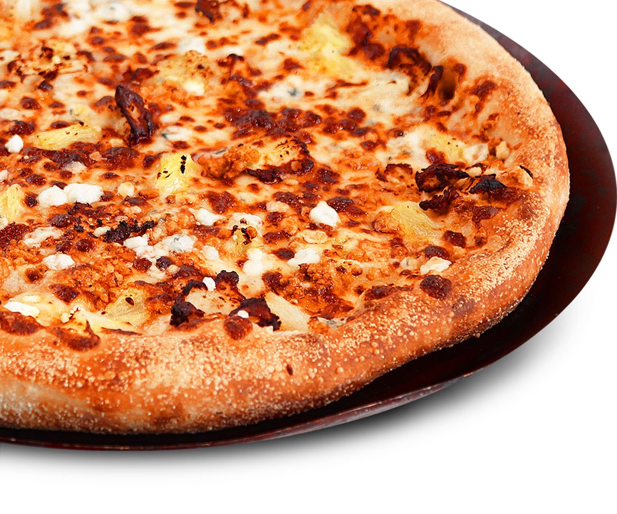 Favorites pizza - Rapeapohjainen gluteeniton pizza, jossa on kanaa, ananasta, AURA®juustoa, tomaattikastiketta ja mozzarellajuustoa. Huomioithan, että gluteenittomat pizzat paistetaan samassa uunissa muiden pizzojen kanssa.
