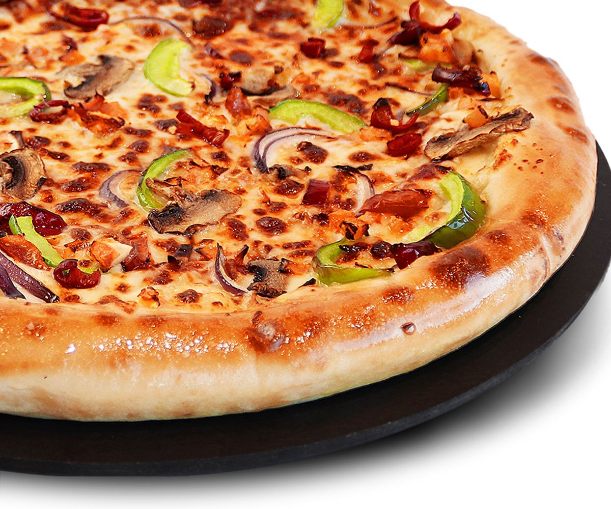 Spicy pizza - Tomaattikastiketta, vegaanij**stoa, jalopenoja ja vegaanipepperonia. Ei saatavilla Cheesy Crustina.