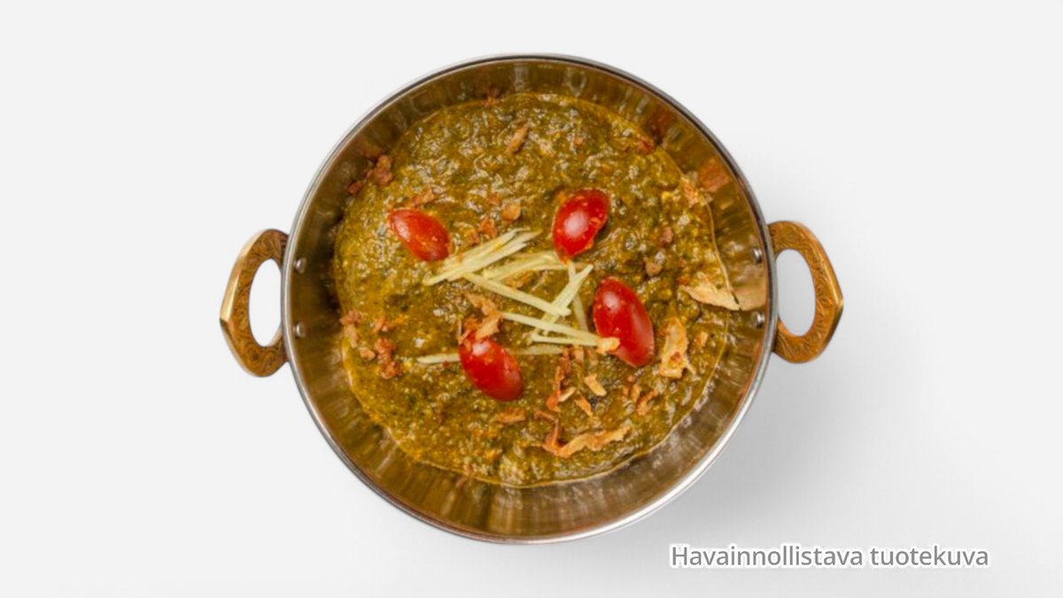 Talon tuorejuustoa (paneer) ja pinaattia, pehmeästi pannulla kypsennettynä valkosipulin ja inkiväärin kanssa täyteläisessä kermakastikkeessa. Tarjoillaan basmatiriisin ja vastaleivotun naan-leivän kanssa.