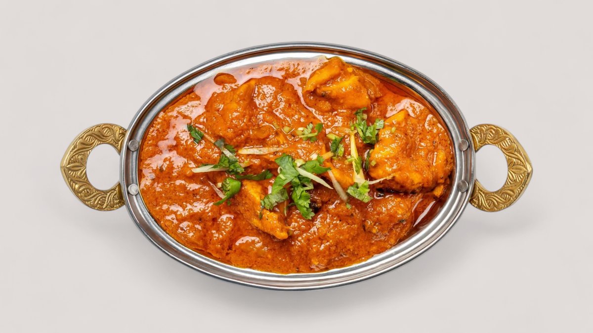 Yrtti-jogurttimarinoituja ja tandoori-uunissa grillattuja kanafileepaloja tomaatti-sipuli-valkosipuli-inkivääri-chili-masalakastikkeessa Tarjoillaan basmatiriisin ja vastaleivotun naan-leivän kanssa.