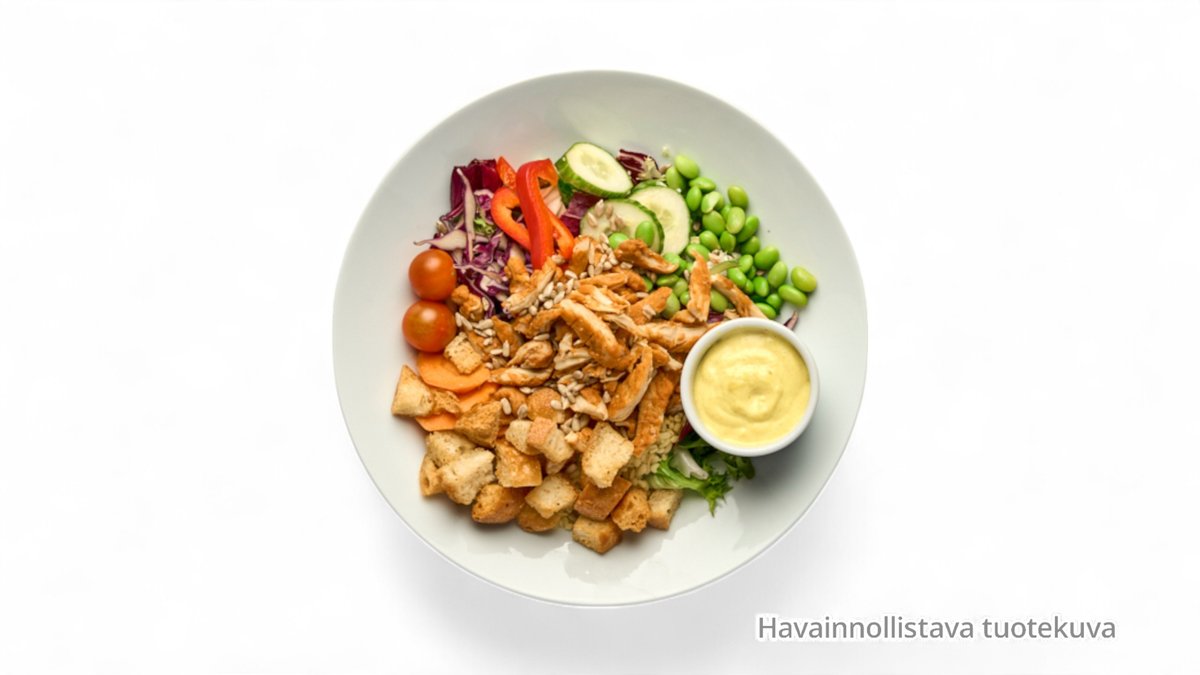 Kaikkiin annoksiin sisältyy: kanakeba, salaatti, tomaatti, kurkku, punasipuli, jogurttikastike