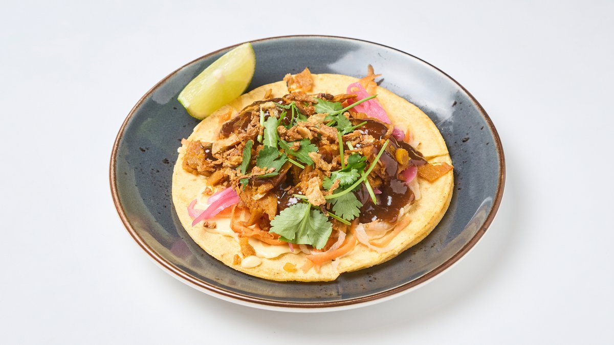 Corn tortilla, vegan mayo, carrot, radish, onion, coriander, fried onion