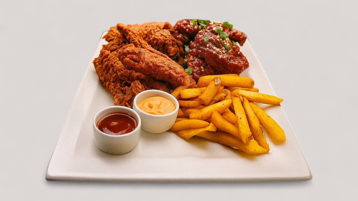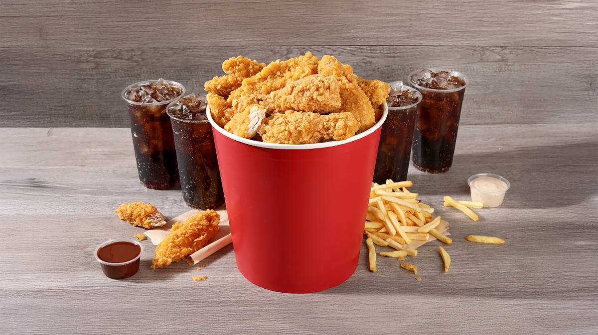 12 siipeä, 8 suikaletta, 4 paistettua kanaa, 8 nuggettia, 4 ranskalaiset, 4 dippiä, 1,5L juoma