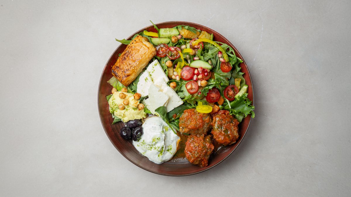 Börek, hummus, tzatziki, paahdettua kanan rintaa, paahdettuja juureksia, Oliivi,Feta juusto, salaattia Huom! Oliivissa voi olla kivi.