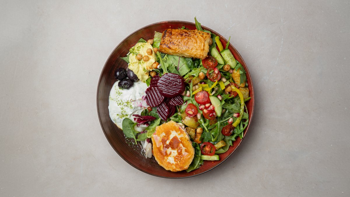 Börek, hummus, tzatziki,paahdettuja juureksia, grillattu Chevré juusto, oliivi,salaattia Huom! Oliivissa voi olla kivi.