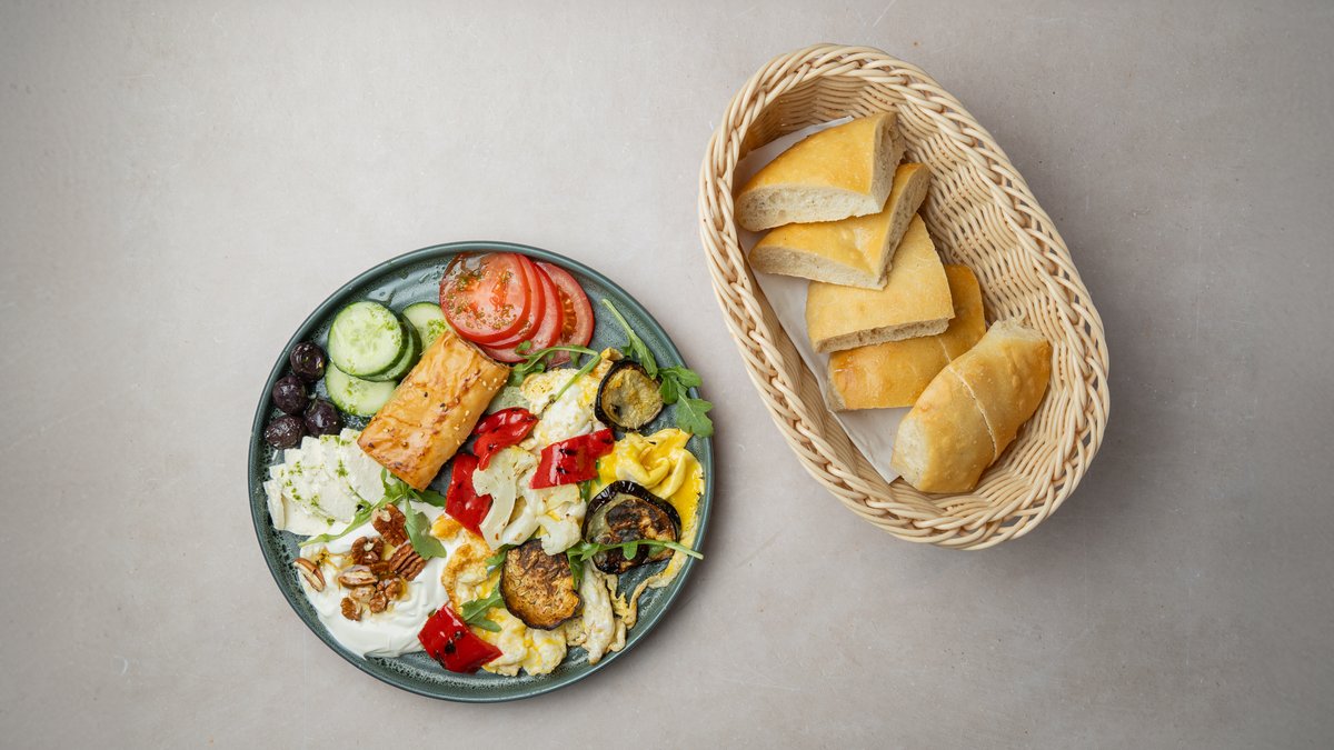 Talon oma pita leipä, Börek-pinaattifeta piiras, munakas, paahdetut kavikset, tuore juusto, feta juusto, kurkku, tomaatti, oliivi, hunaja sekä tuoremehu Huom! Oliivissa voi olla kivi.
