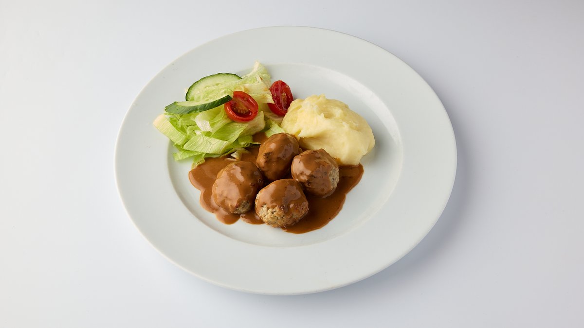 Lihapullia, kermakastiketta, perunamuusia ja salaattia