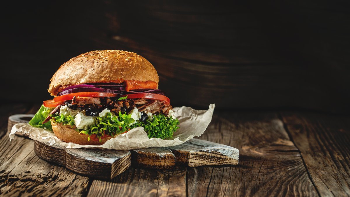 Kaikkiin annoksiin kuuluu: 130 g naudanliha pihvi, salaatti, tomaatti, grillattu sipuli, suolakurkku, hampurilaiskastike ja cheddarjuusto