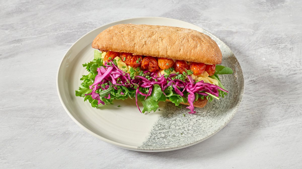 Fluffy scrambled eggs with roasted cherry tomatoes, creamy mayo, and crisp cabbage salad in soft toasted bread