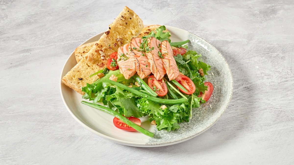 A vibrant mix of greens, cherry tomatoes, green beans, egg, walnuts and crisp basil vinaigrette. Served with toasted garlic bread. Chicken, Salmon, Prawn, Tofu