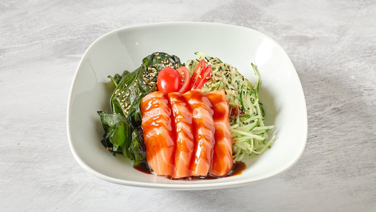 Tuna & salmon sashimi tossed in house BBQ-sauce with spring onions, walnuts, sesame seeds, cucumber, pickled ginger, wakame, coleslaw & cherry tomatoes