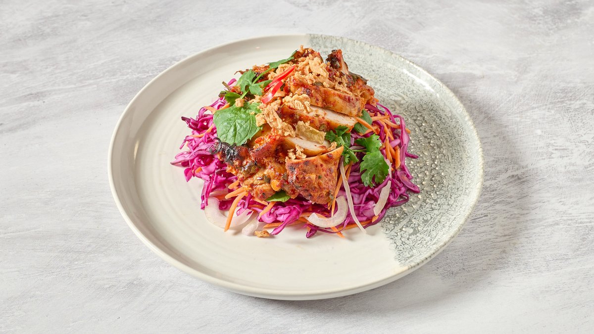 Zesty lime chicken tossed with cabbage, carrot, onion, and fresh Asian herbs, topped with salted peanuts and served with a crispy rice cracker & a tangy fish sauce dressing