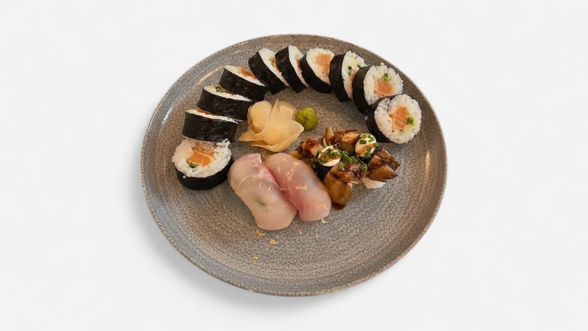 Grilled salmon maki ( 10 pcs), shiso whitefish nigiri (2 pcs), grilled mushroom nigiri (2 pcs)