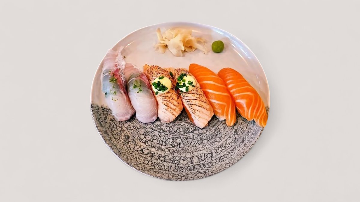 Salmon nigiri (2 pcs), grilled salmon nigiri (2 pcs), shiso whitefish nigiri (2 pcs)