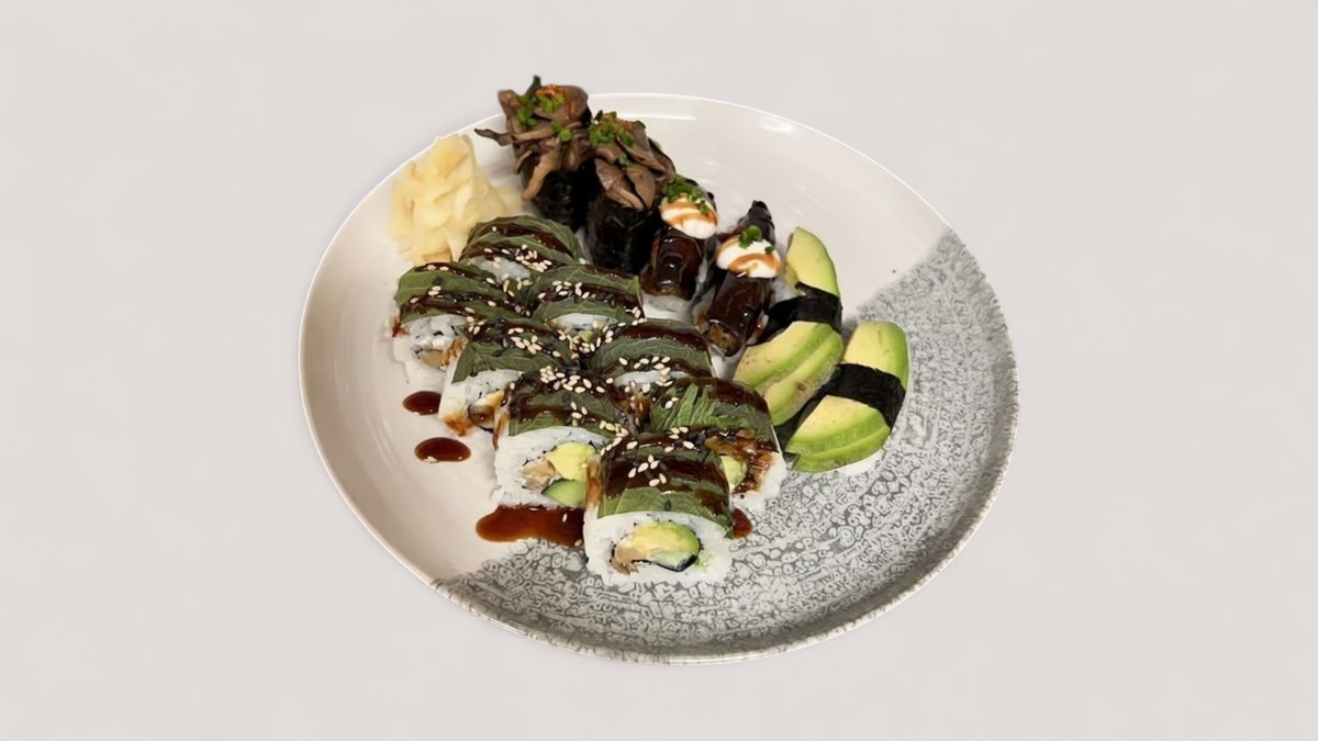 Shiso maki (8 pcs), avocado nigiri (2 pcs), stewed mushroom gunkan (2 pcs) grilled eggplant nigiri (2 pcs)
