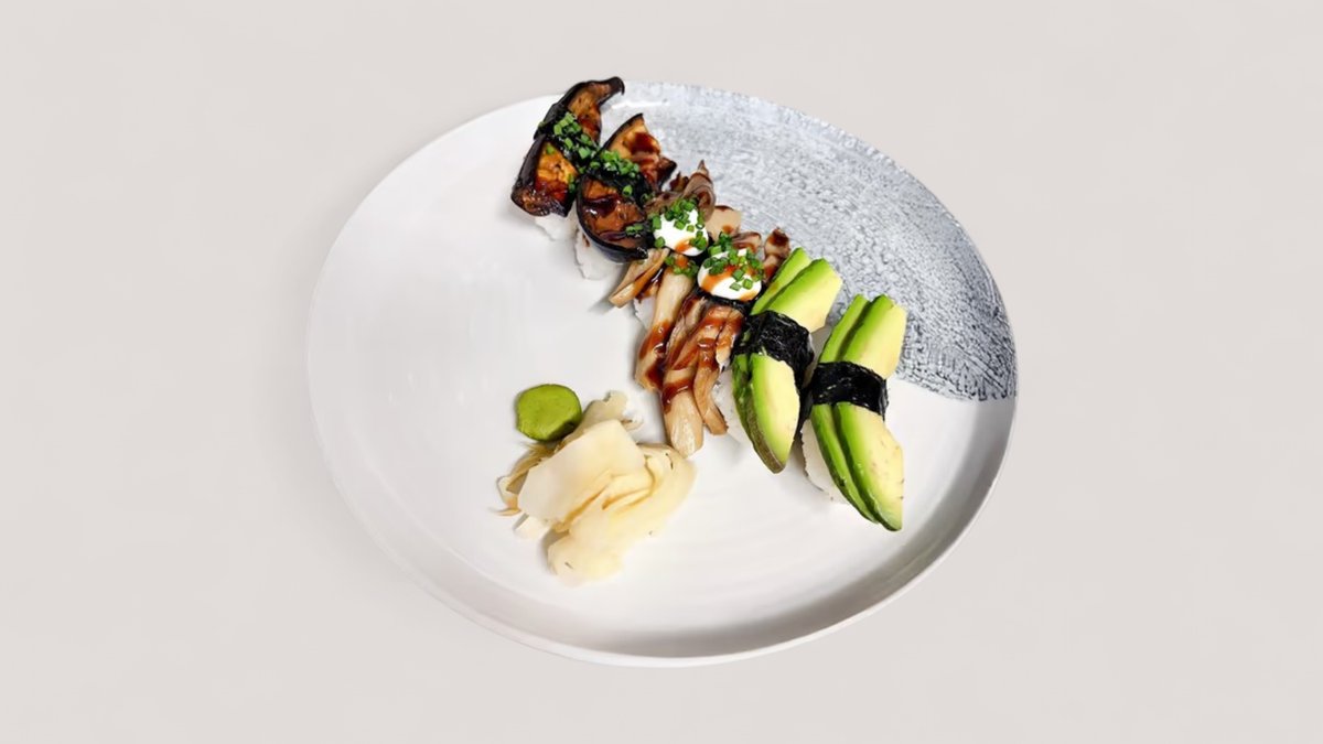 Avocado nigiri (2 pcs), grilled mushroom nigiri (2 pcs), grilled eggplant nigiri (2 pcs)