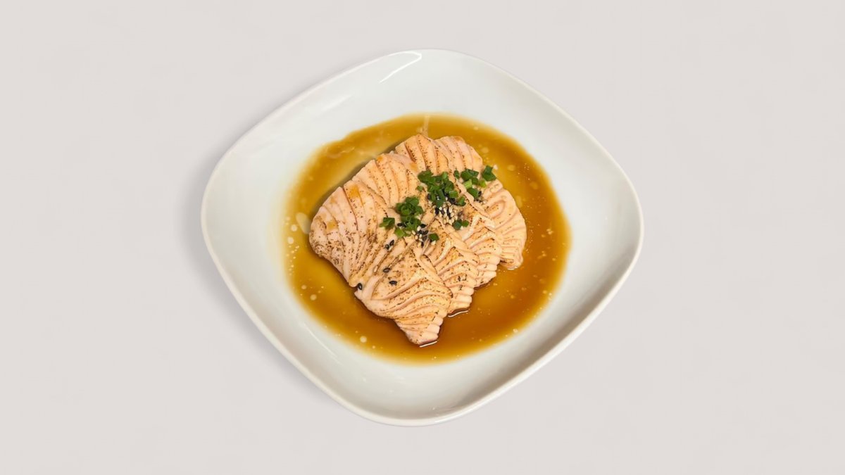 Salmon, teriyaki sauce, chives, sesame seeds
