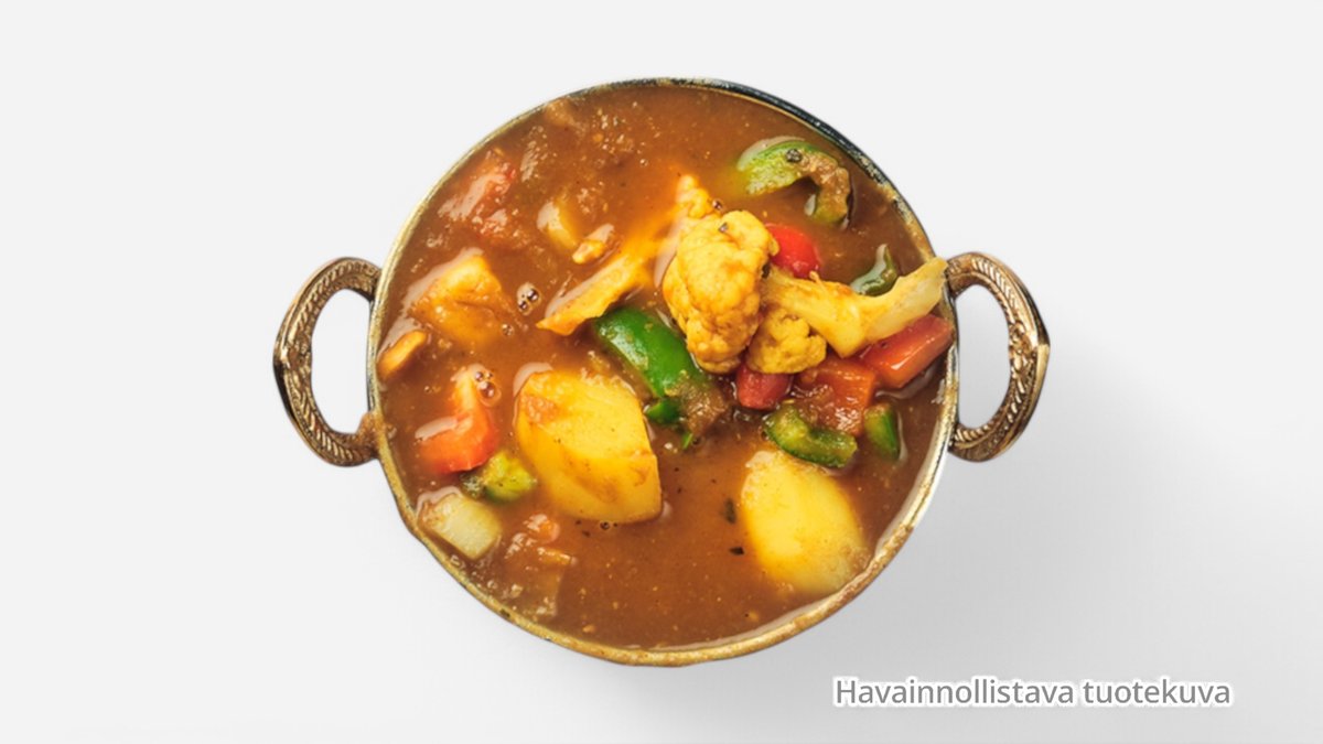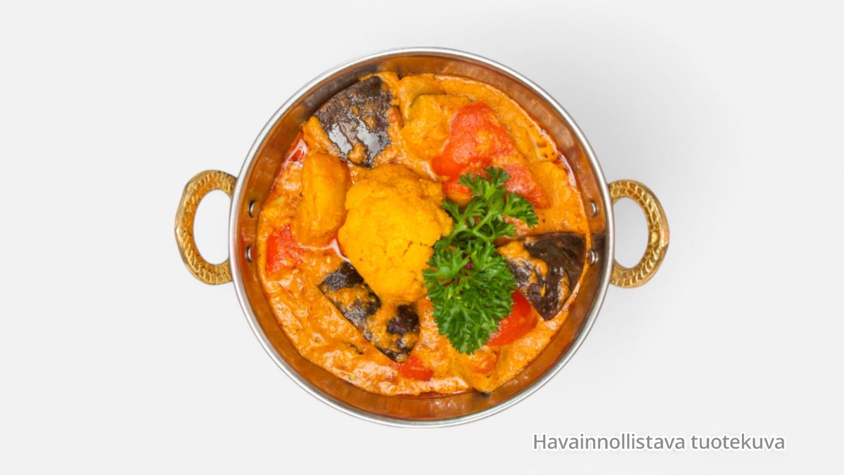 Yritti-jogurtissa marinoitua, tandoorissa grillattua jättikatkaravut ja paistettu punasipuli, porkkana & paprikaa mausteisessa kookos-cashewpähkinä- kerma-tomaatti-valkosipuli-inkivääri- sipuli kastikkeessa. (G,L)