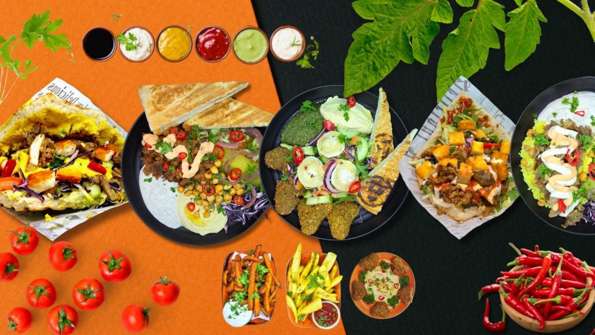 paahdettua pide-leipää, paistettua brokkolia, falafelia, hummusta, tomaattia, kurkkua, tabulea, tuore salaattimix, suolakurkkua, punakaalia, punasipulia, vegaanimajoneesi, persiljaa