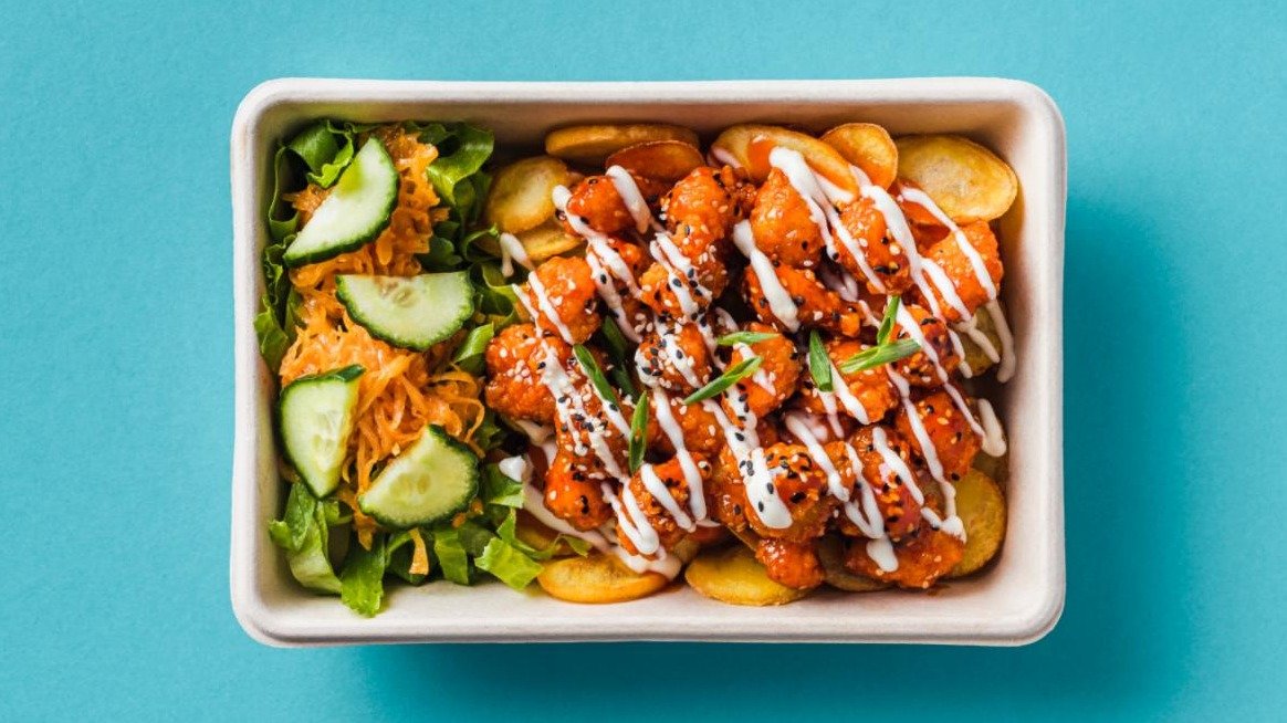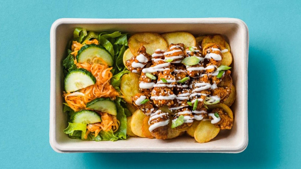 Deep fried chicken popcorns with classic Korean sweet & spicy sauce and aioli, served with salad and dollar chips.