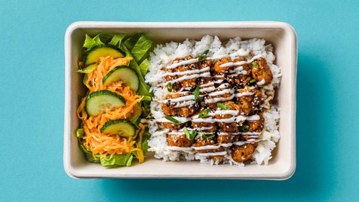 Deep fried chicken popcorns with teriyaki sauce and aioli, served with salad and rice.