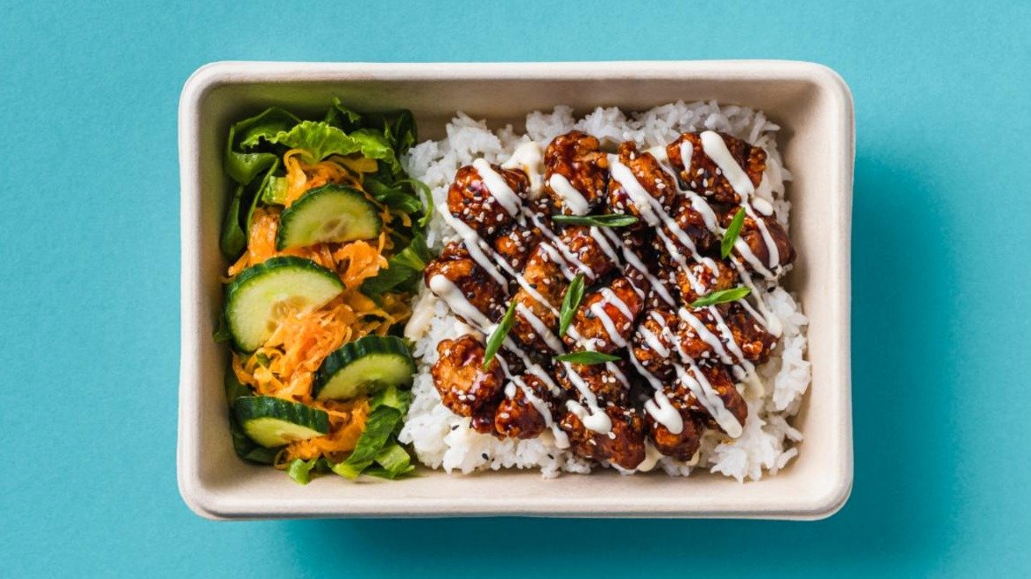 Deep fried dumplings with Korean sweet & spicy sauce and aioli, served with salad and rice.