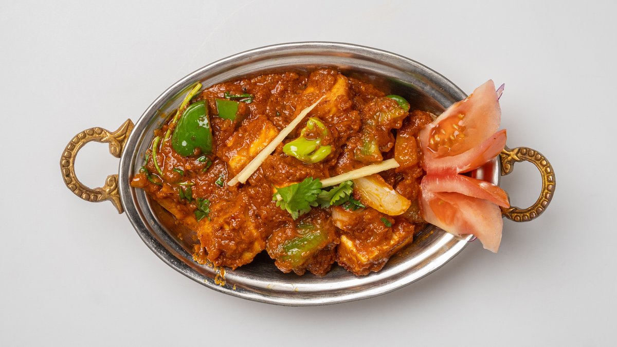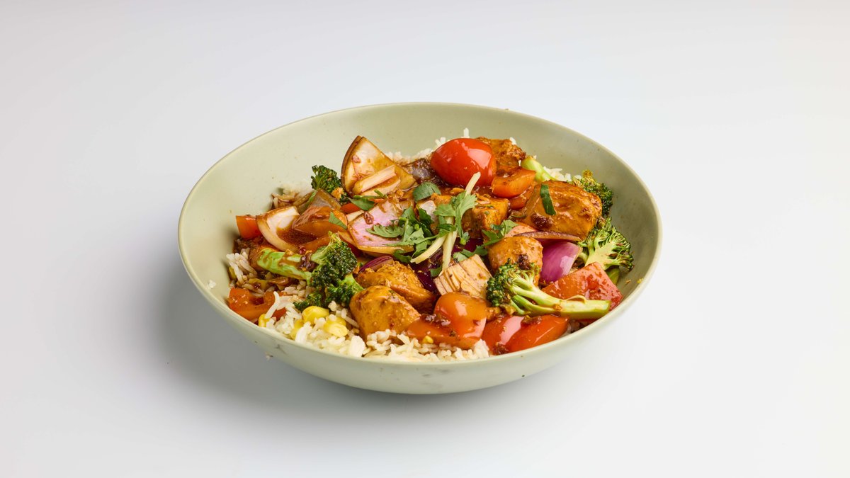 Our Vegan Tofu Chili features crispy tofu cubes stir-fried with bell peppers, onions, and chilies in a bold, spicy, and tangy sauce. Served with rice.