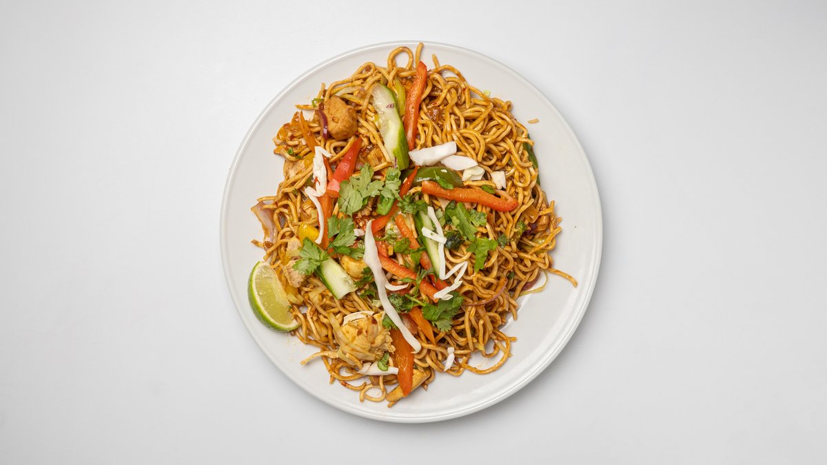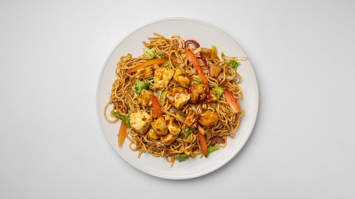 Full plate of noodles and protein as per costumer choice and comes with 5 ppl dumplings plus one mango lassi
