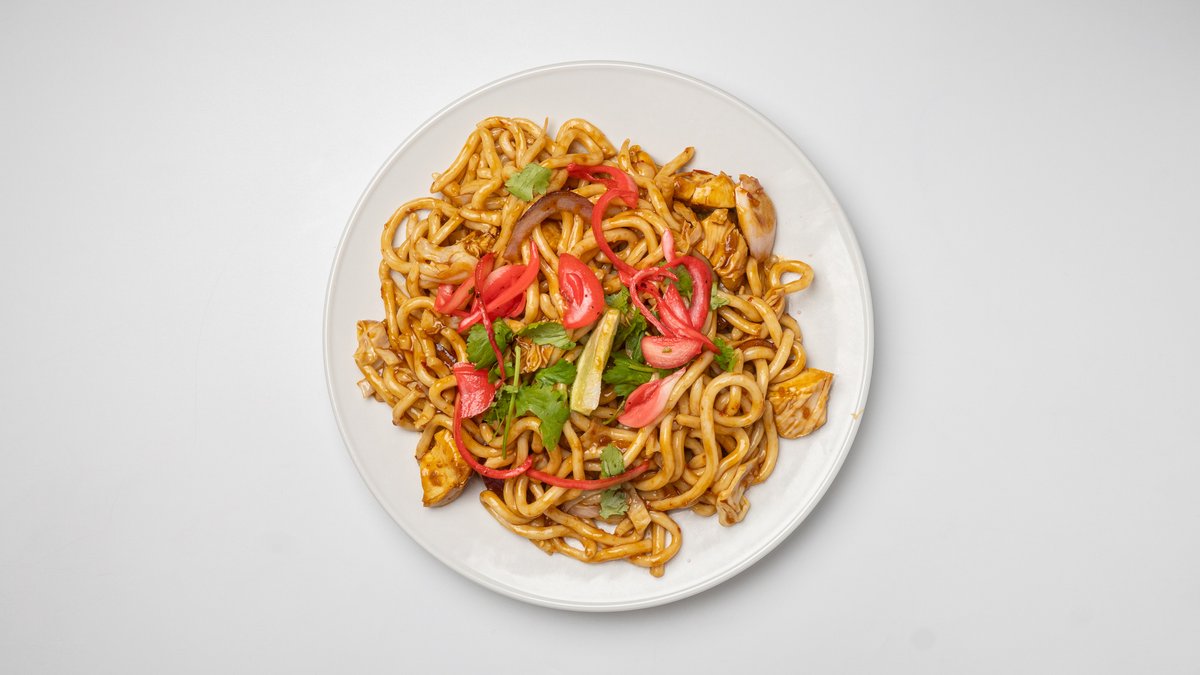 Udon noodles, chicken, shrimp, zucchini, red onion, bamboo, chili sauce