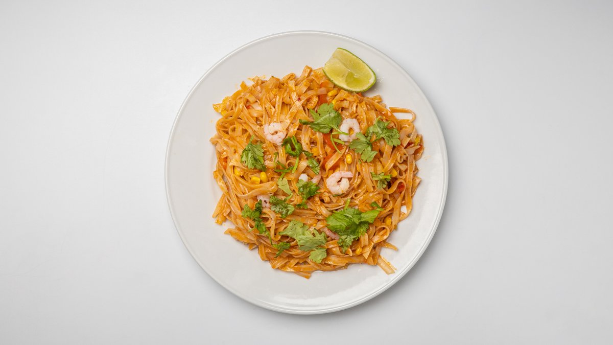 Rice noodles, egg, bamboo, red onion, capsicum, fish sauce, pad thai sauce