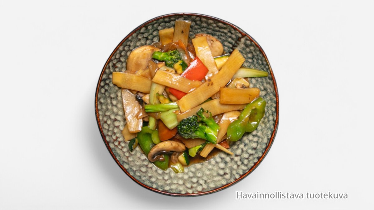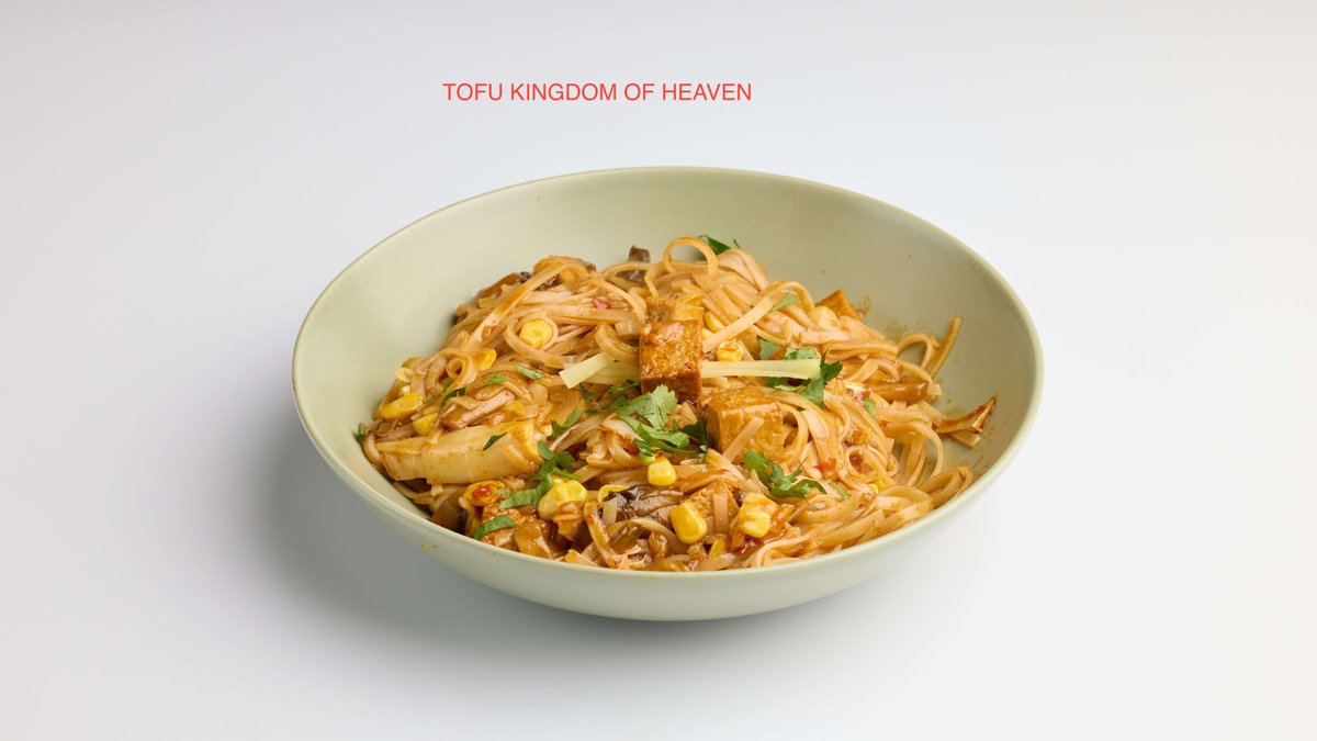 Rice noodles, tofu, bamboo, mushroom, sweet corn with sweet chili sauce