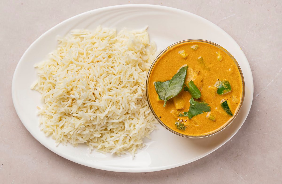 chicken gravy with medium spicy delicious comes with plain rice , capsicum and red onion
