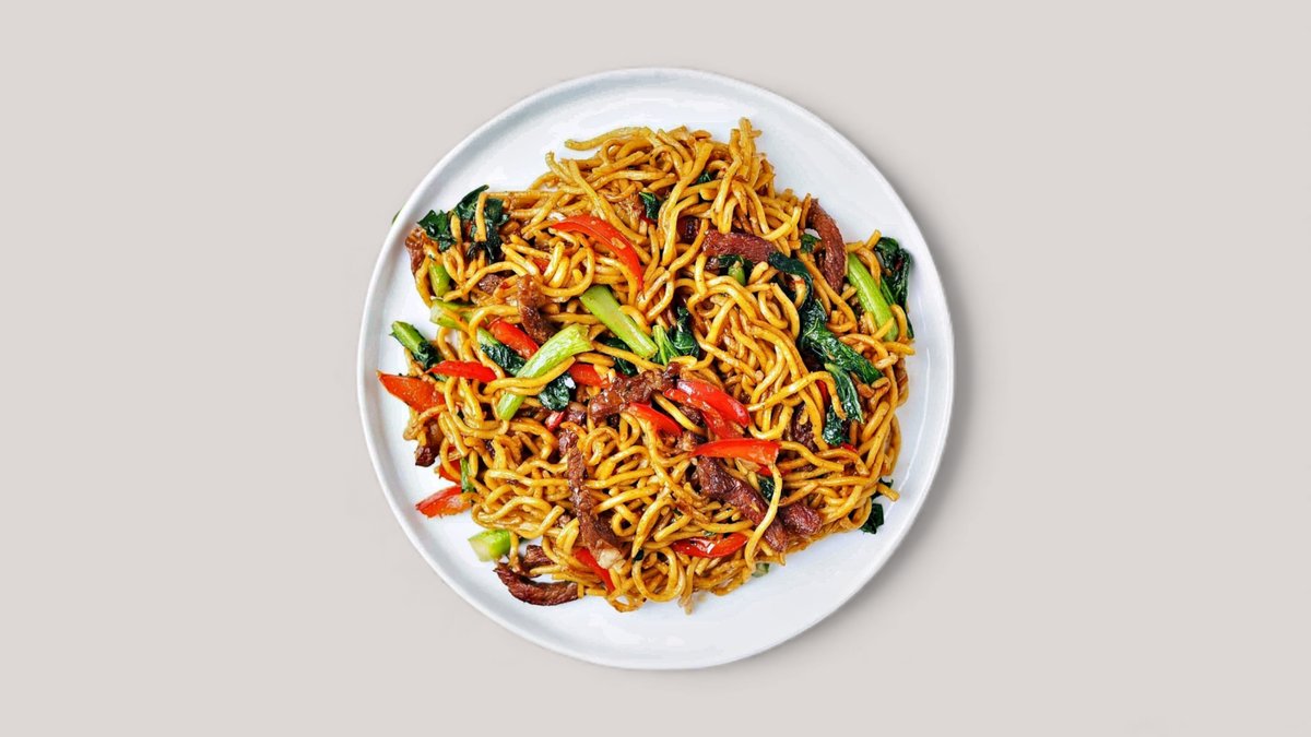 Egg noodles, chicken, broccoli, capsicum, red onion, spiced sauce
