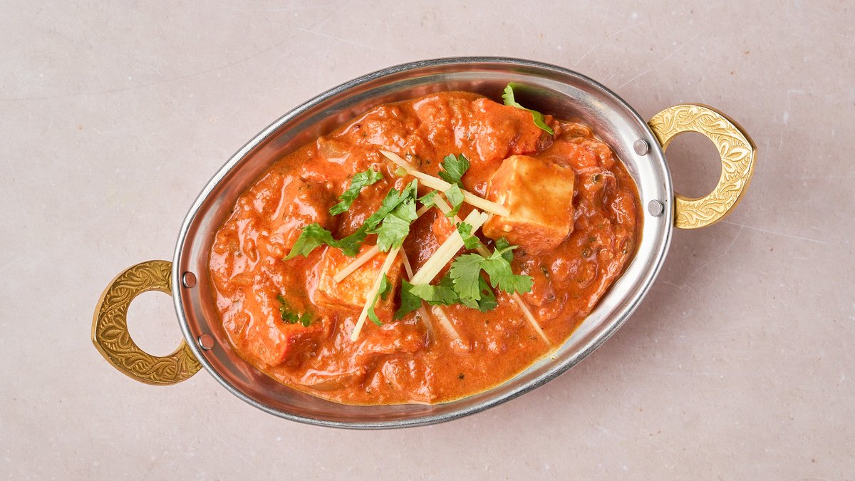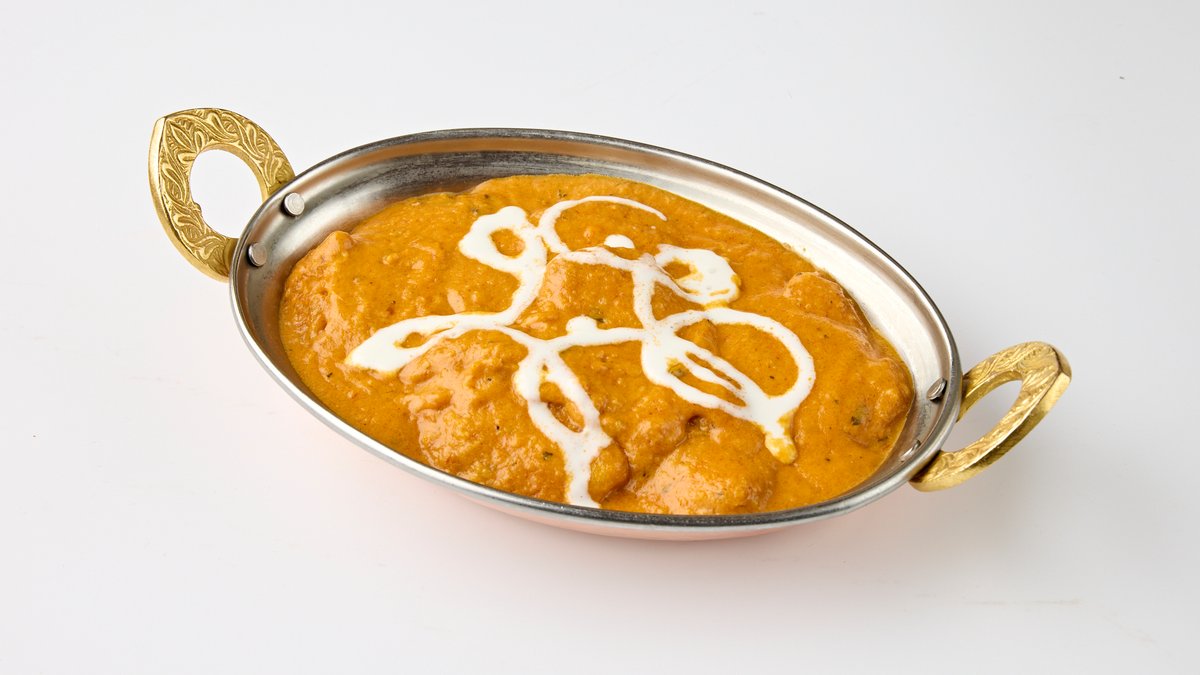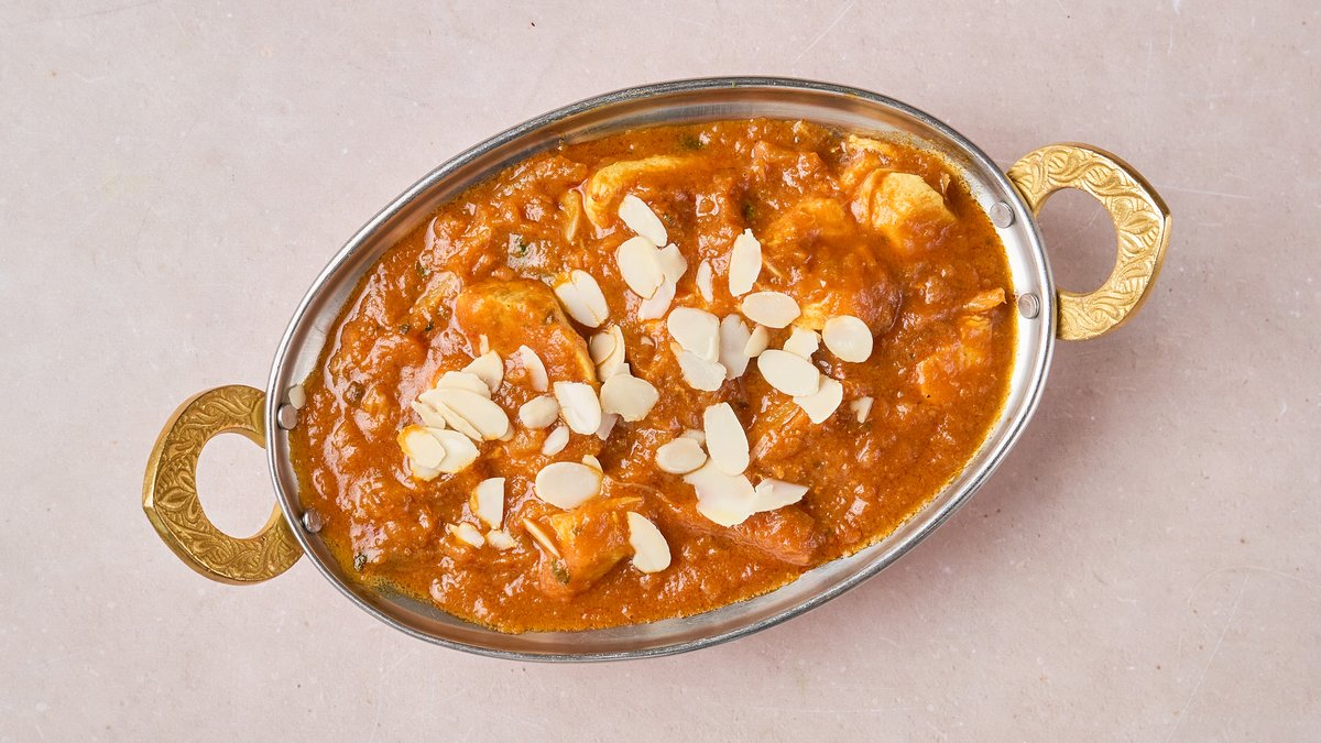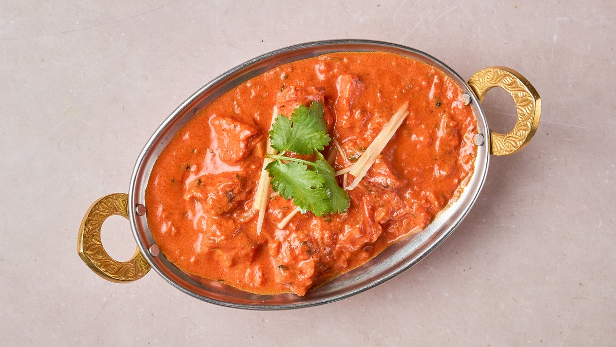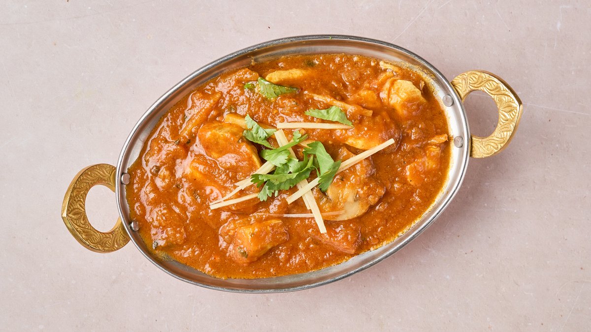 Yrtti-jogurttimarinoituja ja tandoori-uunissa grillattuja kanan rintafilee paloja tomaatti-, cashew-, inkivääri-, sipuli-, chili, kerma- ja masalakastikkeessa Herb and yoghurt marinated and tandoor oven grilled chicken fillet pieces in tomato, cashew, ginger, onion, chili, cream and masala sauce