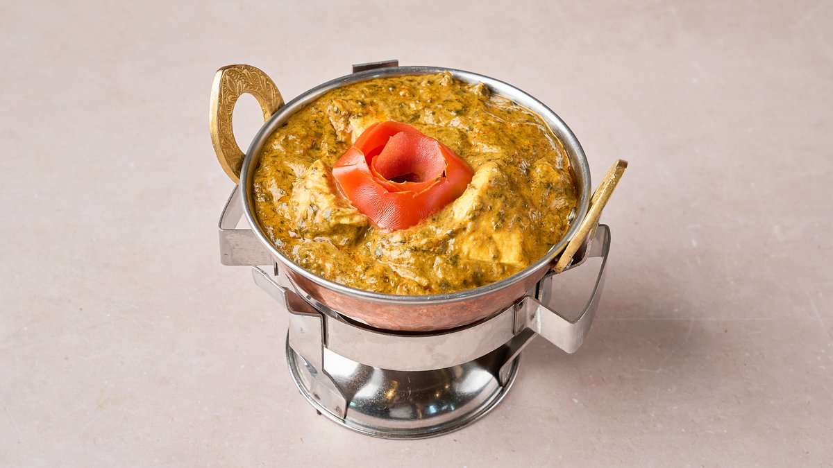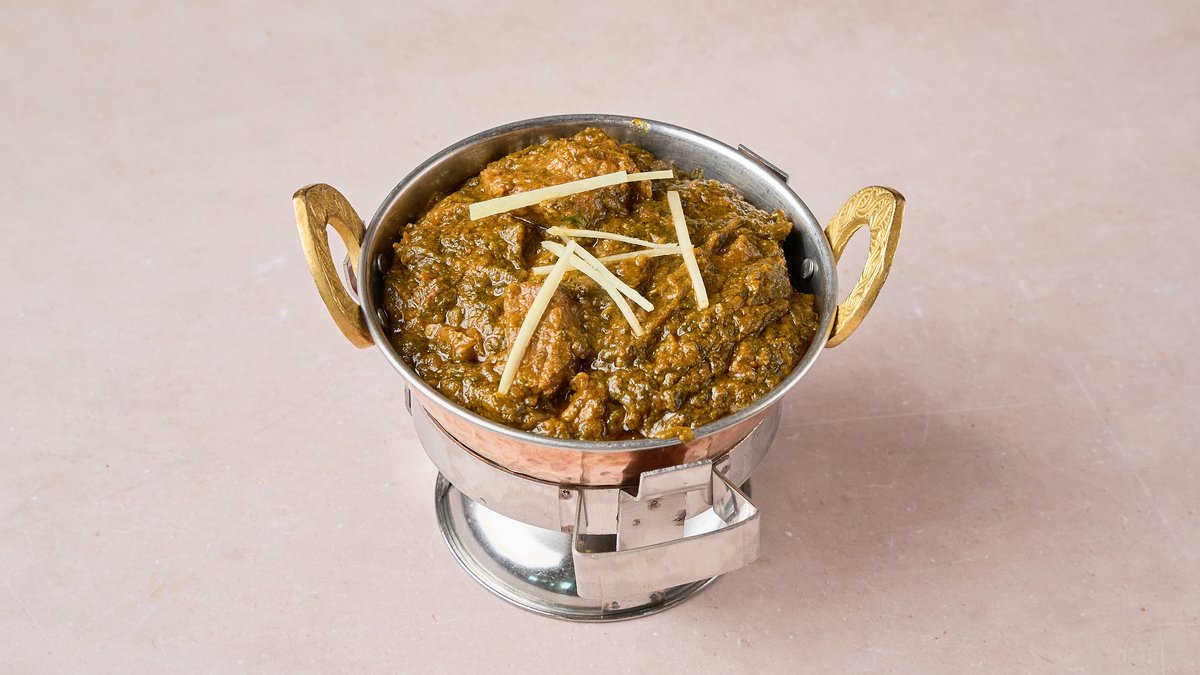 Haudutettuja lampaan paloja pinaatti-, valkosipuli- ja currykastikkeessa Stewed lamb pieces in spinach, garlic and curry sauce